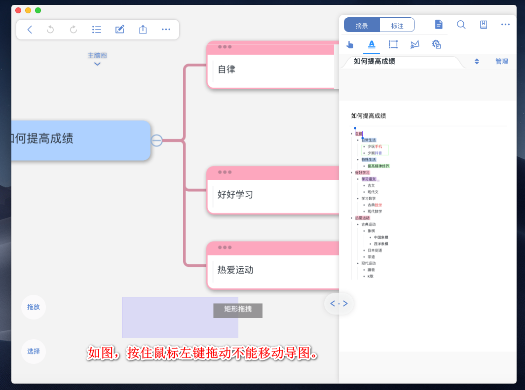 如图,在思维导图区域,我按住鼠标左键,拖动,只会提示矩形拖拽。