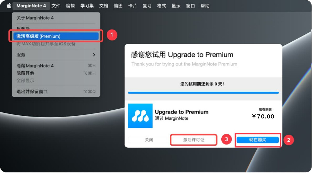 如需进一步激活高级版,请从顶部菜单栏点击"MarginNote4→激活高级版(Premium)“,在弹出窗口中点击“现在购买”,价格为70元人民币。