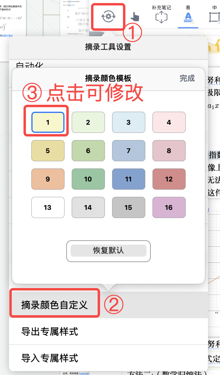 导入摘录颜色配置后,当前学习集已有的摘录卡片颜色将全部被替换,支持恢复默认配色: