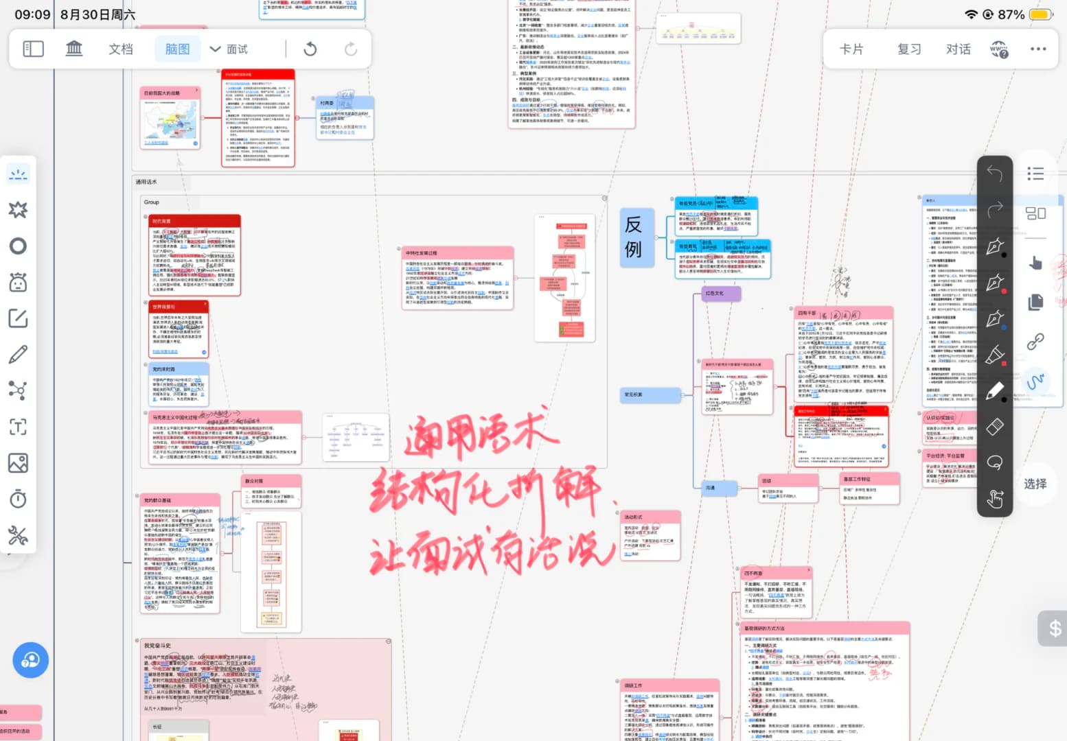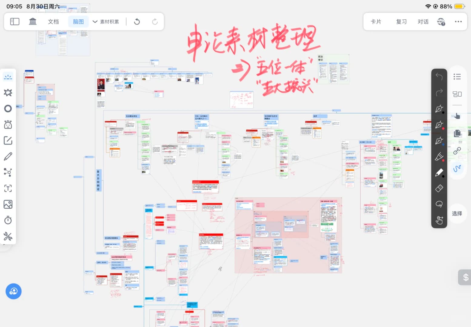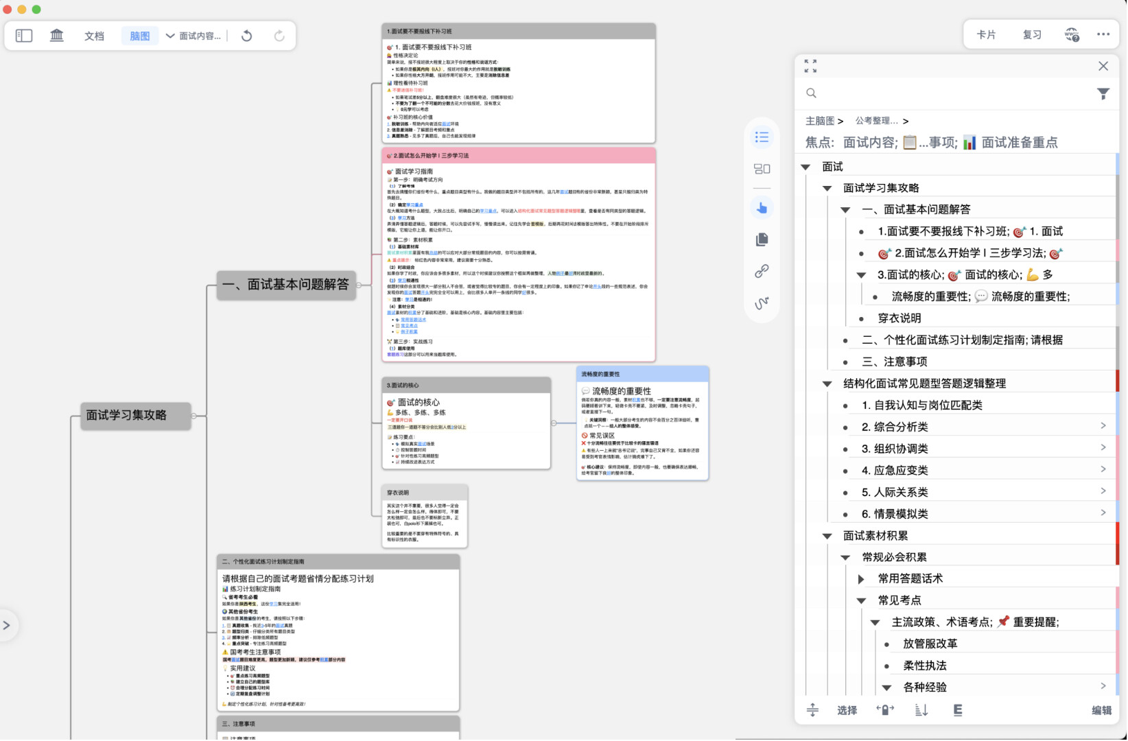 由于个人备考时间相对宽裕,因此在备考初期就想着以内容丰富、广泛积累开始。我除了资料分析用的纸质版书籍以外,其余科目包括后期的背诵全是在平板上完成,算是使用率比较高。脑图核心部分主要包括了申论的结构化素材、面试的实用素材整理两部分。其余部分简单做了知识点整理,如果你需要也可以简略浏览: