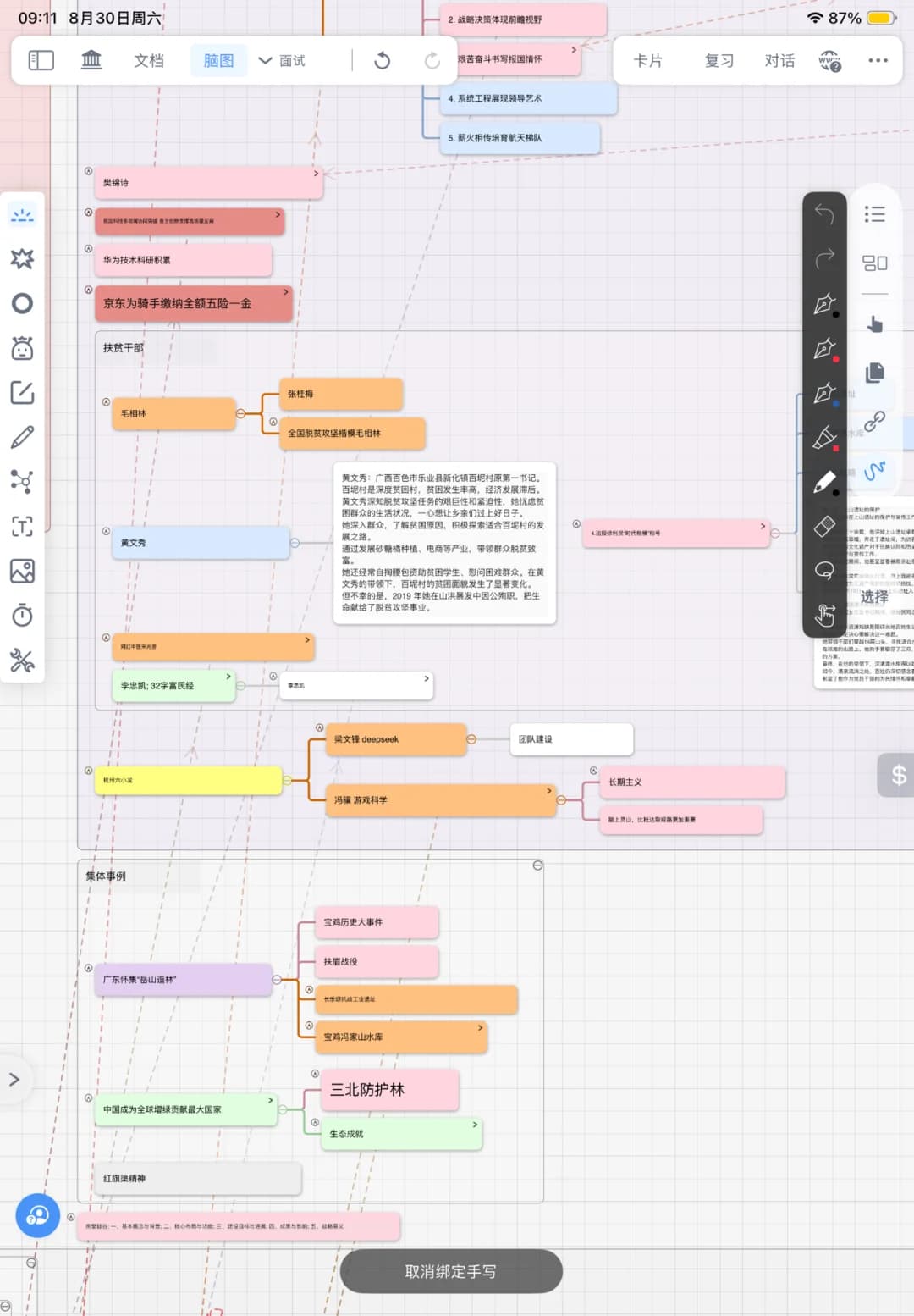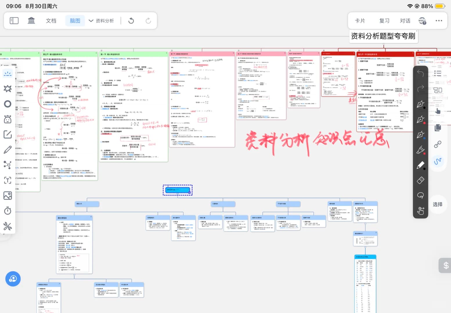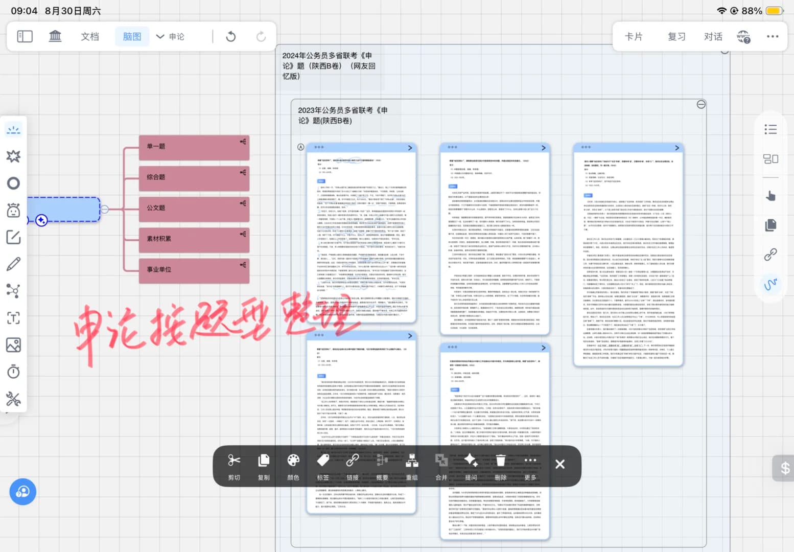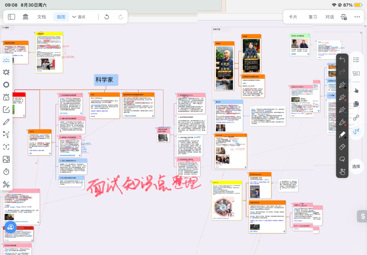 由于个人备考时间相对宽裕,因此在备考初期就想着以内容丰富、广泛积累开始。我除了资料分析用的纸质版书籍以外,其余科目包括后期的背诵全是在平板上完成,算是使用率比较高。脑图核心部分主要包括了申论的结构化素材、面试的实用素材整理两部分。其余部分简单做了知识点整理,如果你需要也可以简略浏览: