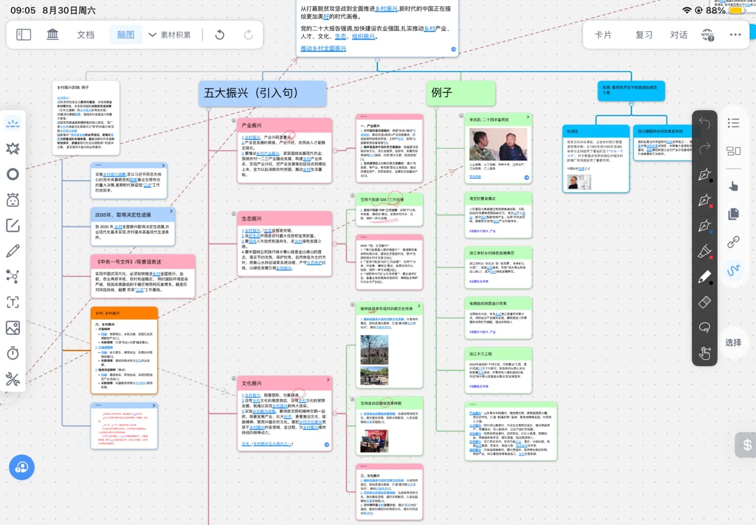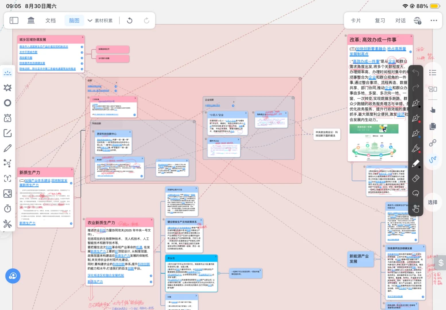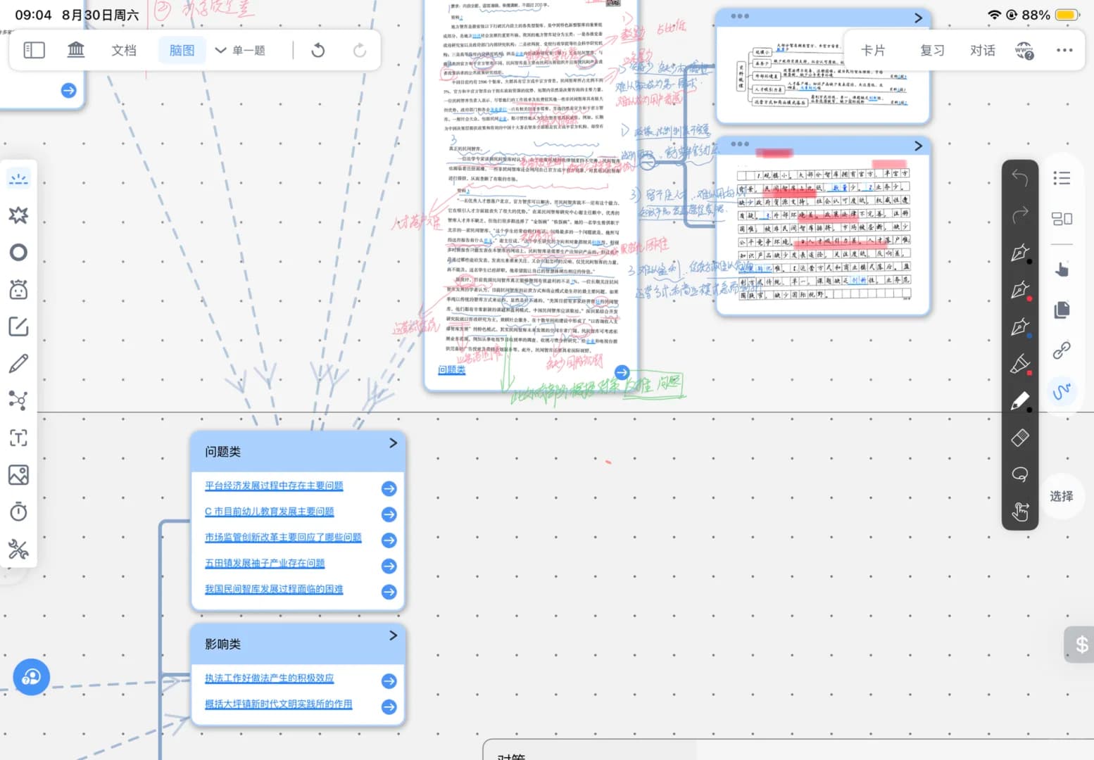 这时候就不得不提到字典词条和pdf搜索功能,当你做一道题时候,你应该会粗略的有印象相关的内容有摘录过,或者此前在时政里听过,但具体在哪我相信学习初期你还是会有困难,所以如果你开启词条、你的摘录大标题会在其他卡片中高亮,或者你进到pdf里直接搜索关键词,会很快的出现,此刻的二次记忆往往会更让你印象深刻。当然这些我建议前期就要做好pdf的整合和个人的一些摘录的规范,包括颜色、命名逻辑等等。双链功能同理。