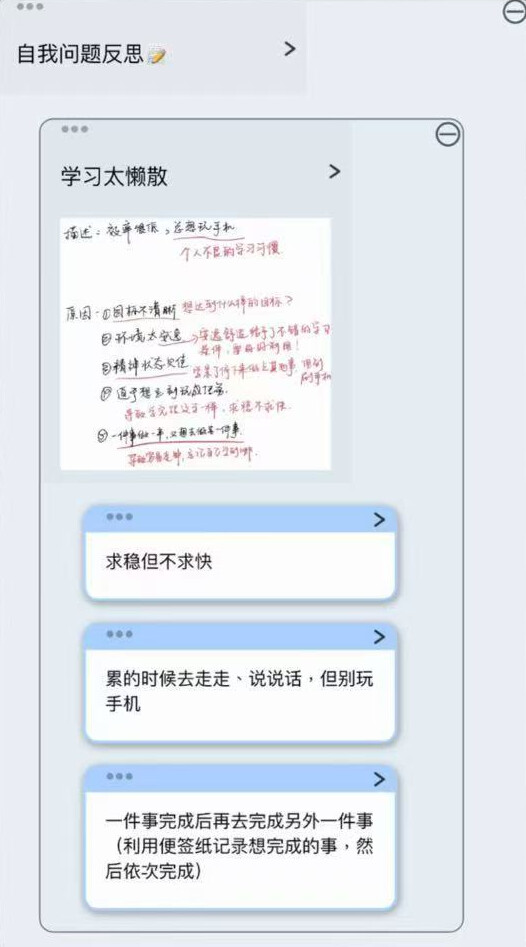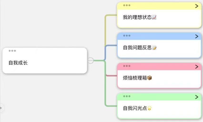 问:你的“自我成长”脑图,将不同维度的自我观察放在一起(理想状态、问题反思、烦恼梳理、闪光点),像一个完整的内心生态系统。这个框架是你一开始就设计好的,还是在实践中逐渐成型的? 其设计逻辑是什么?