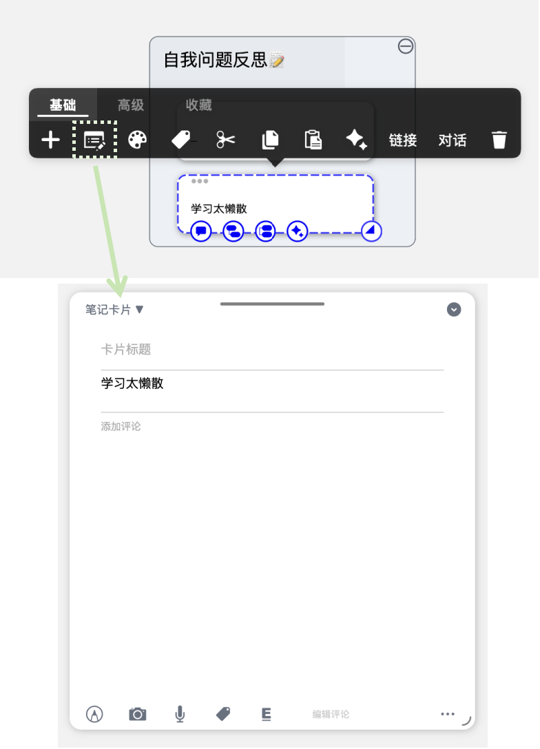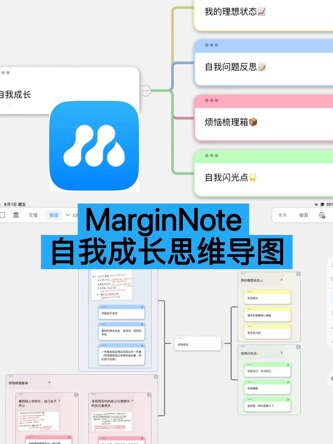 MarginNote不仅能学习,它的软件功能也正好利于我制作这份“自我成长思维导图”:例如,我希望每一个内心想法能像一封“信件”,寄往该去的“邮箱”里,而思维导图的不同分支正是这些“邮箱”。我很喜欢MarginNote脑图中的“框架”分支,让我可以把这些“信件”平坦、整洁地放置在“邮箱”里。并且,MarginNote中每一个卡片都能打开记录更详细的内容,当我需要将“信件”拆封、分析时,卡片编辑功能正好可以满足我。