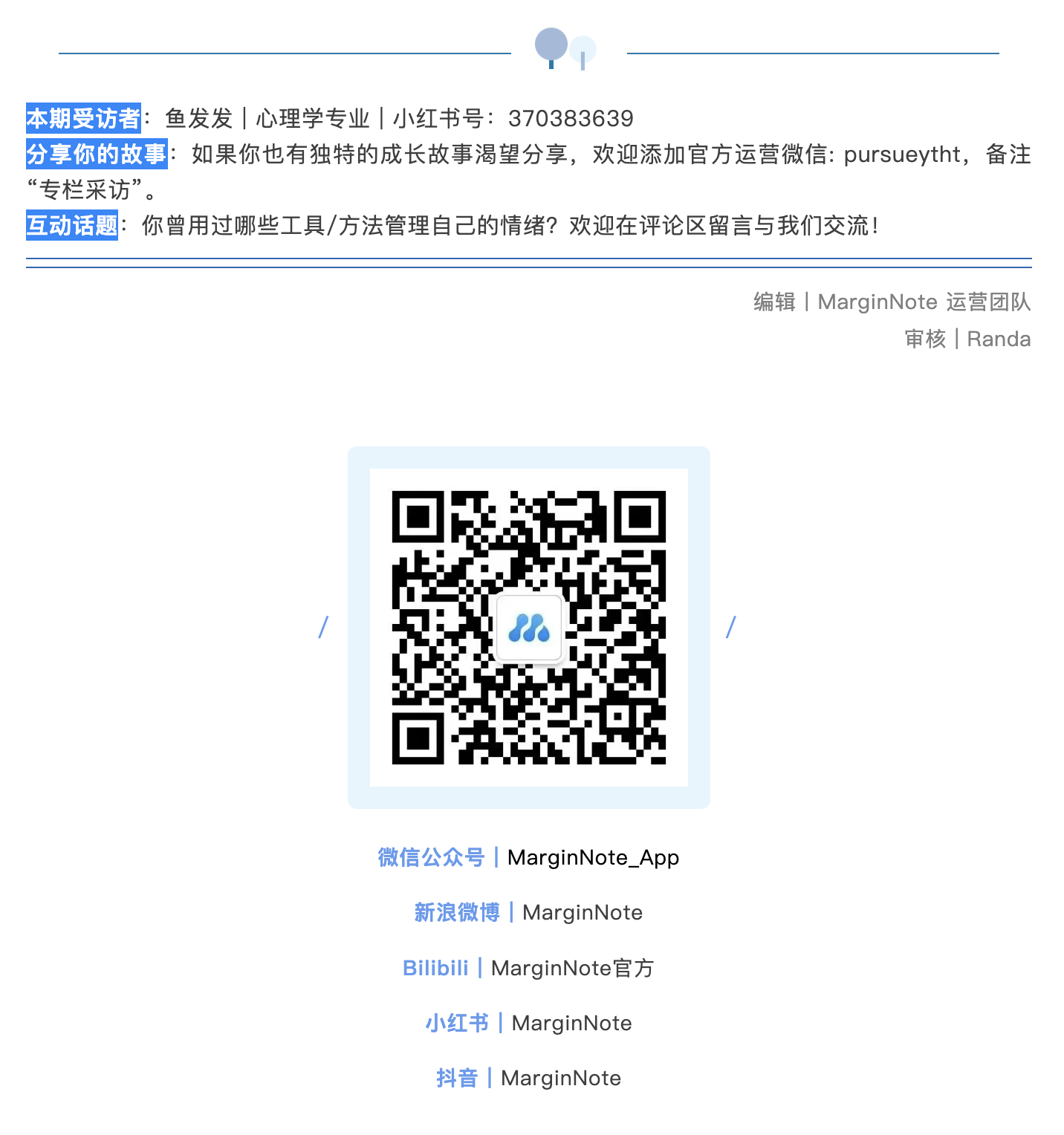 编者按 :MarginNote 能做什么?整理文献、备考刷题、构建知识体系?是的,但我看到鱼发发的分享时,我意识到远不止于此。 “理性的思考是需要训练的。”这是鱼发发开始用 MarginNote 进行自我梳理时最真切的体会。当柔软杂乱的情绪遇到理性严肃的工具,一种奇妙的化学反应正在悄然发生。