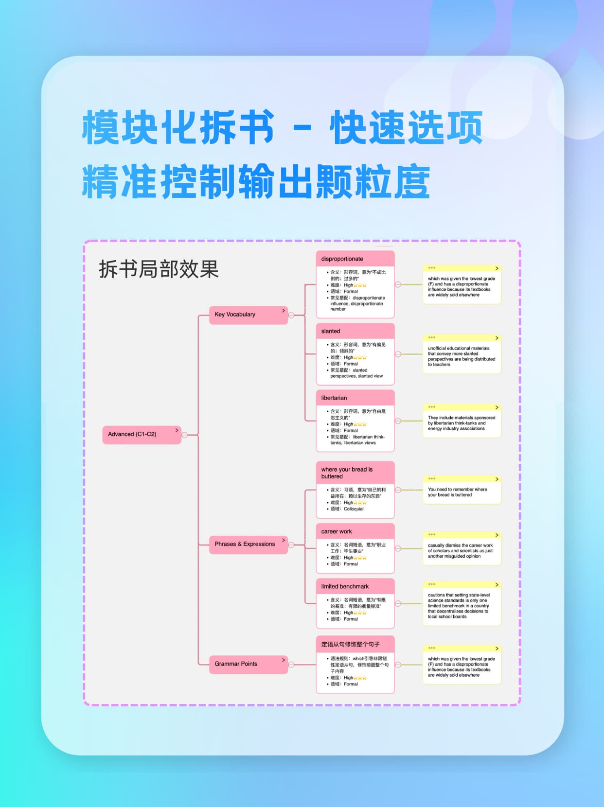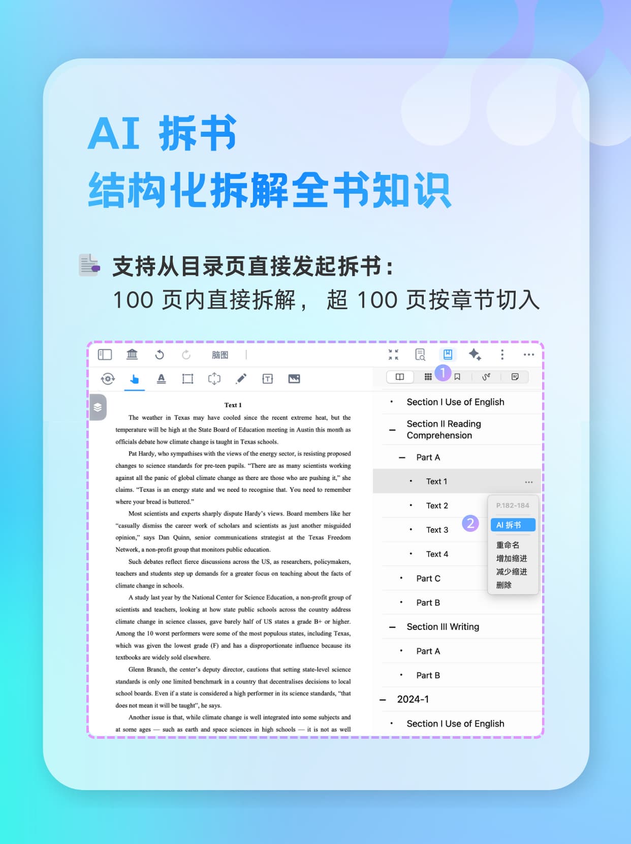 • 整书拆解:100 页内直拆,超 100 页按章节切入