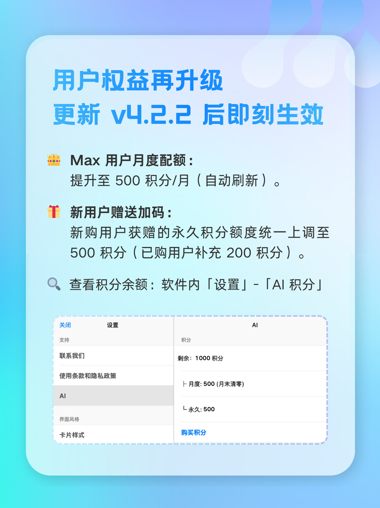 • 积分查询:软件内「设置」 - 「AI积分」