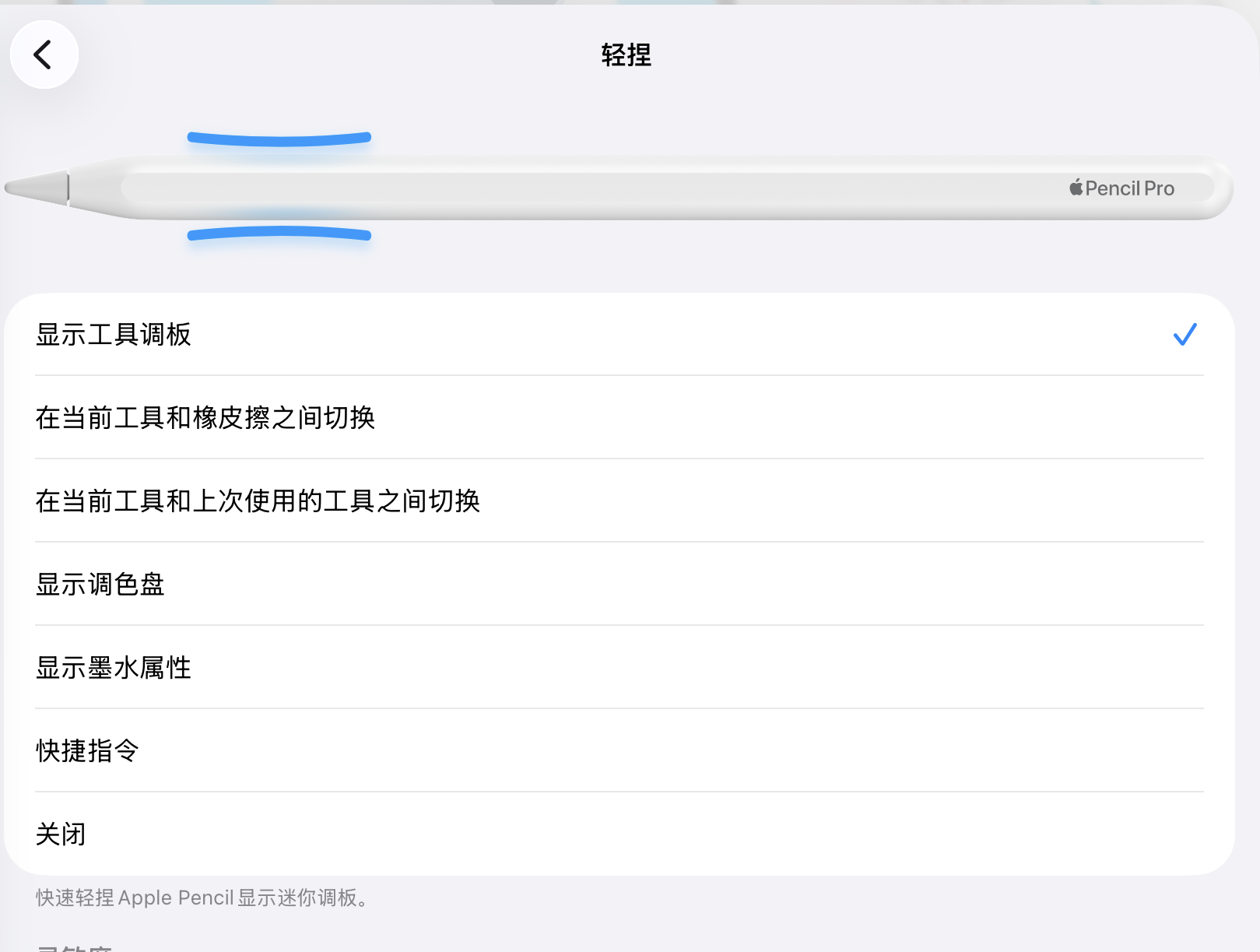 iPad中关于pencil轻捏的设置是,“显示工具调板”(如图所示),但是轻捏后没有出现工具板,变成了当前工具与橡皮擦之间切换。这个是怎么回事?是不是bug?之前一直使用正常,重装后出现这个问题。