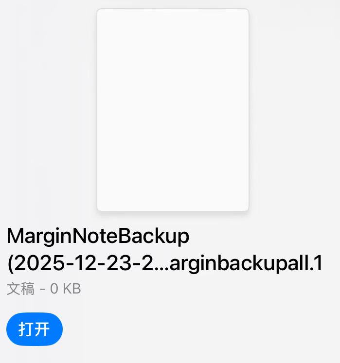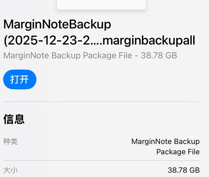 我尝试通过设置里面的备份与恢复备份全部数据库和全部文档时成功导出一个38GB的以marginbackupall为后缀的文件,然后发现直接传输到windows系统里变成一个文件夹,而且总大小从38GB变成36GB,经过询问AI得知这个文件已经无法再导入回Ipad恢复