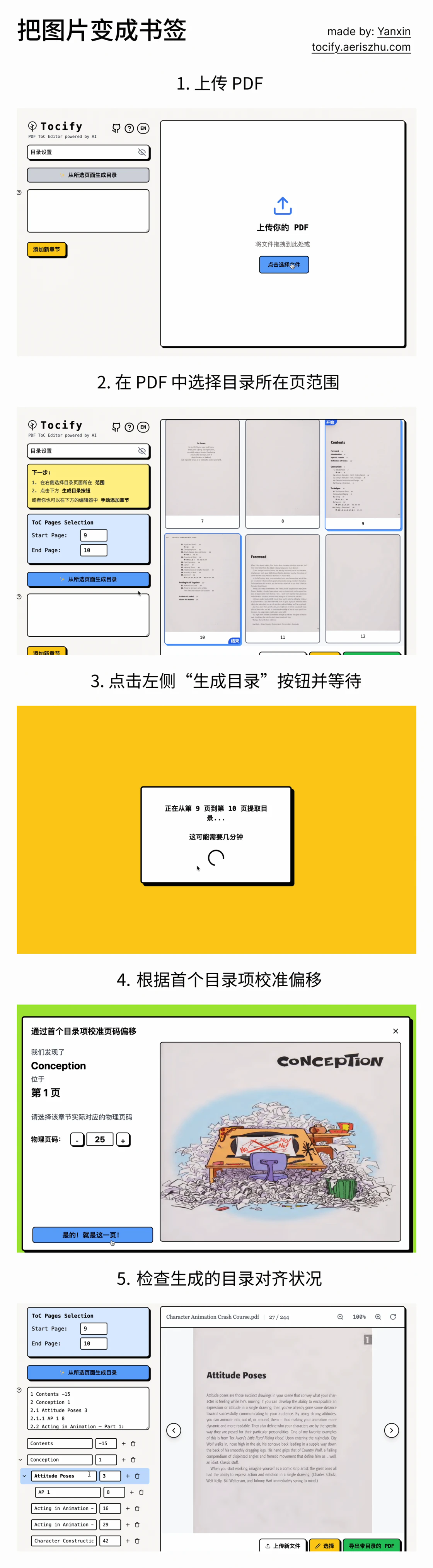 只要原 PDF 中存在结构化的目录页,就可以通过 AI 识别快速导出符合要求的目录结构给 PDF 加上侧边栏书签,此核心功能针对影印版 / 电子版文件均有效。 即使没有,Tocify 也支持本地手动添加,而无需下载任何软件。